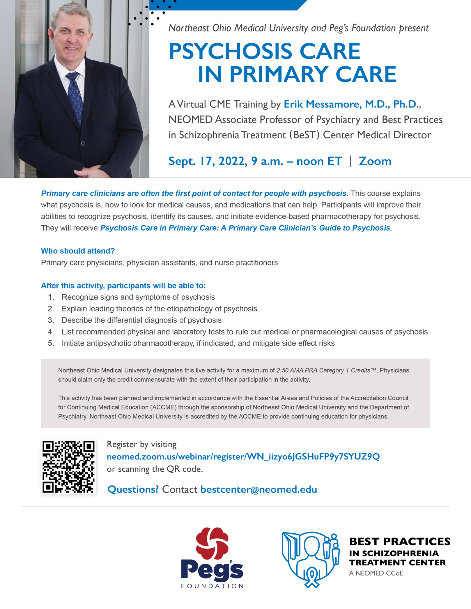 Primary care clinicians are often the first point of contact for people with psychosis. Please join Northeast Ohio Medical University and Peg's Foundation Saturday, September 17, 2022, from 9 a.m. - noon ET for a virtual CME Training, Psychosis Care in Primary Care, by Erik Messamore, M.D., Ph. D., NEOMED Associate Professor of Psychiatry and Best Practices in Schizophrenia Treatment (BeST) Center Medical Director. Participants will receive Psychosis Care in Primary Care: A Primary Care Clinician's Guide to Psychosis.