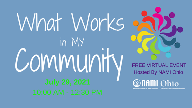 We also invite you to join NAMI Ohio for “What Works in My Community” on July 29, 2021, from 10 a.m. – 12:30 p.m. This event will feature Ohio programs that provide programming and outreach to diverse populations and focus on why culturally competent mental health services are critically important and what makes these services successful. The program will include a panel of experts and individuals served by these programs. Register for this free, virtual event here<https://namiohio.org/virtual-event-july-29th/>.