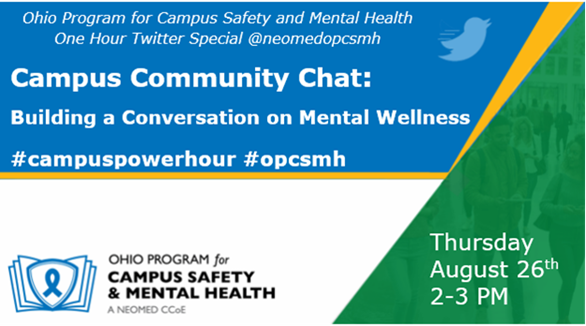 What to expect? You can expect the Ohio Program for Campus Safety and Mental Health Twitter moderator to tweet out questions one-by-one giving time for participants to respond. We encourage all participants to join in the discussion. Please contact us to request questions in advance at opcsmh@neomed.edu<mailto:opcsmh@neomed.edu>