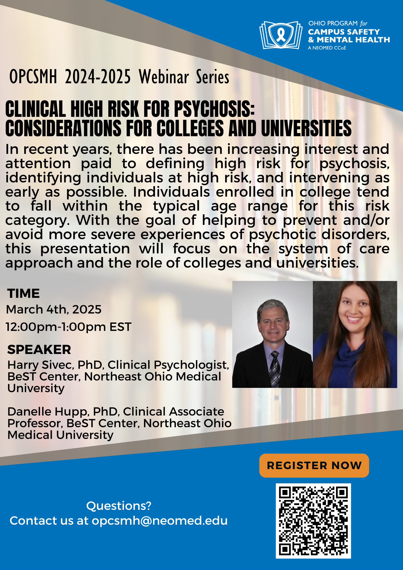 Join the OPCSMH on Tuesday, March 4th at 12:00pm EST for the OPCSMH March 2025 webinar! We will be joined by Harry Sivec, PhD, Clinical Psychologist, BeST Center, Northeast Ohio Medical University and Danelle Hupp, PhD, Clinical Associate Professor, BeST Center, Northeast Ohio Medical University. In recent years, there has been increasing interest and attention paid to defining high risk for psychosis, identifying individuals at high risk, and intervening as early as possible. Individuals enrolled in college tend to fall within the typical age range for this risk category. With the goal of helping to prevent and/or avoid more severe experiences of psychotic disorders, this presentation will focus on the system of care approach and the role of colleges and universities.