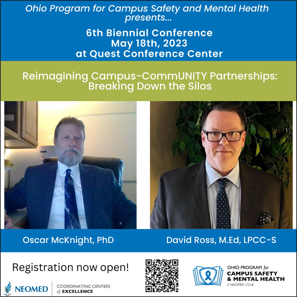 In conjunction with the Mental Health & Recovery Board of Ashland County, Ashland University has a thirty-year community partnership within the city and the county at large. Their mutual goal is to leverage and merge resources to promote safety, well-being, and mental health services to our shared stakeholders. Oscar McKnight, PhD, Associate Dean, Student Affairs, Director of Psychological Counseling & Health Services, Ashland University, and David Ross M. Ed, LPCC-S, Executive Director, The Mental Health & Recovery Board of Ashland, join us to discuss the partnership between the two organizations, the synergy required when University Systems and Community partners join forces, how participants can recognize the mental health networking opportunities that build and enhance the town-gown partnership, and the win-win-win benefit for the Student, Community, and University when promoting wellness and mental health resources.