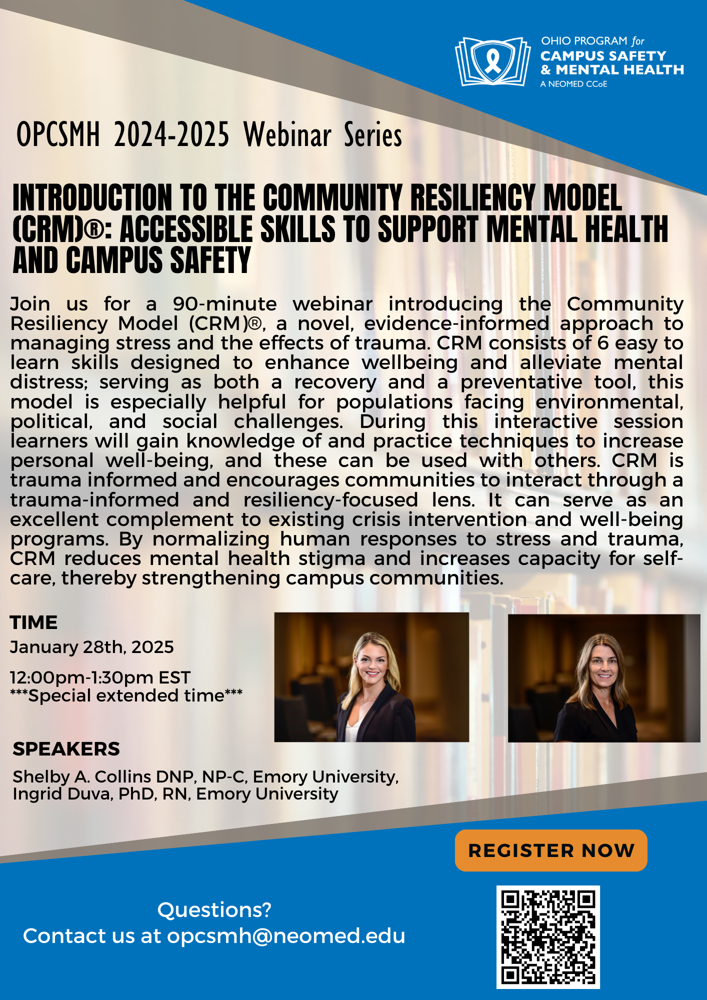 Join the OPCSMH for the first webinar of 2025! Dr. Ingrid Duva and Dr. Shelby Collins will join us to discuss The Community Resiliency Model (CRM)(r), a novel, evidence-informed approach to managing stress and the effects of trauma. CRM consists of 6 easy to learn skills designed to enhance wellbeing and alleviate mental distress; serving as both a recovery and a preventative tool, this model is especially helpful for populations facing environmental, political, and social challenges.
