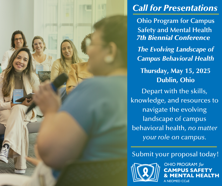 The Ohio Program for Campus Safety and Mental Health is excited to announce that we are issuing a Call for Presentations for the OPCSMH 7th Biennial Conference, which will be held in-person at the OCLC Conference Center in Dublin, Ohio on May 15th, 2023. The theme for this year's conference is The Evolving Landscape of Campus Behavioral Health! If you are interested in submitting a proposal for a presentation, please use the link below or see the attached Call for Presenters PDF. The deadline for presentation proposals is February 1st, 2025.