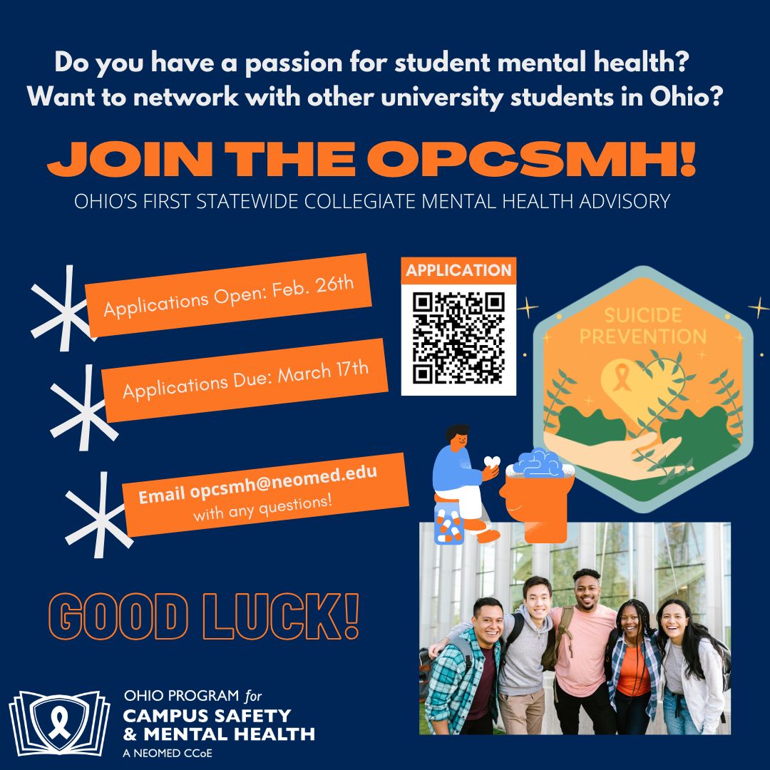 We are excited to partner with fellow students for this exciting advocacy initiative! Please share this opportunity with your students and any other faculty or staff you think may have connections with interested parties. If you have any questions, please feel free to contact us at opcsmh@neomed.edumailto:opcsmh@neomed.edu, or we can direct you to our supervisor, Annaleise Fisher, Suicide Prevention and Health Promotion Manager with the Ohio Program for Campus Safety and Mental Health.