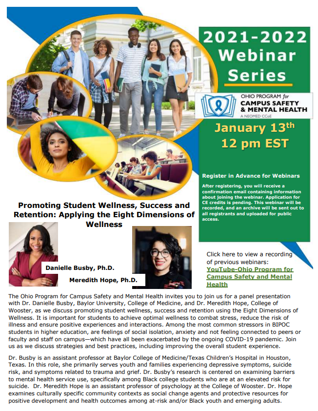 We are looking forward to the OPCSMH webinar: Promoting Student Wellness, Success and Retention: Applying the Eight Dimensions of Wellness this Thursday, January 13th at 12 p.m. – 1 p.m. It’s not too late, register herehttps://neomed.zoom.us/webinar/register/3016334624221/WN_0f2n9aEGTGCmYqHfUOahYQ!