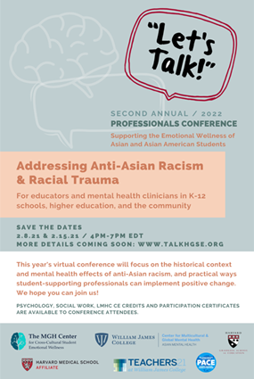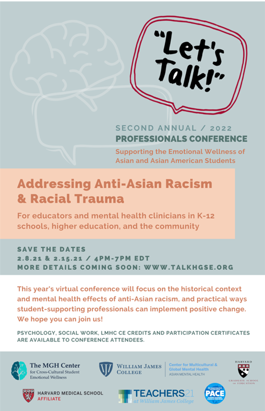 [Let’s Talk! Professionals Conference: Supporting the Emotional Wellness of Asian and Asian American Students!]<http://www.talkhgse.org/>