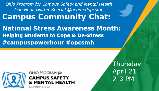 Join us for our next Campus Community Chat tomorrow, April 21st from 2-3 p.m. National Stress Awareness Month: Helping Students to Cope and De-Stress.