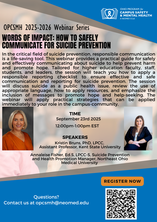 Join the OPCSMH TODAY for the first webinar of the 2025-26 Webinar Series, from 12:00pm-1:00pm EST! We will be joined by Kristen Bruns, PhD, LPCC, Assistant Professor, Kent State University and Annaleise Fisher, Ed.S, LPCC-S, Suicide Prevention and Health Promotion Manager, Northeast Ohio Medical University. Together, they will be providing a practical guide for safely and effectively communicating about suicide to help prevent harm and promote hope. Tailored for higher education faculty, staff, students, and leaders, the session will teach you how to apply a responsible reporting checklist to ensure effective and safe communication and reporting for suicide prevention. We hope to see you there! Click herehttps://neomed.zoom.us/webinar/register/WN_TlcBhFt5Q_qPq5VVWQD48Q#/registration to register!