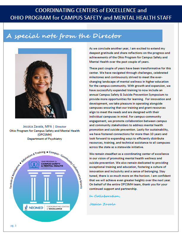 The OPCSMH is happy to announce that the OPCSMH 2022-2024 Program Summary has arrived! We invite you to view it here<https://www.neomed.edu/wp-content/uploads/2024-Program-Summary-Final.pdf> and see how much the OPCSMH has grown and achieved these past few years! We look forward to continuing to support campuses across Ohio, while fostering and establishing partnerships within the campus-community.