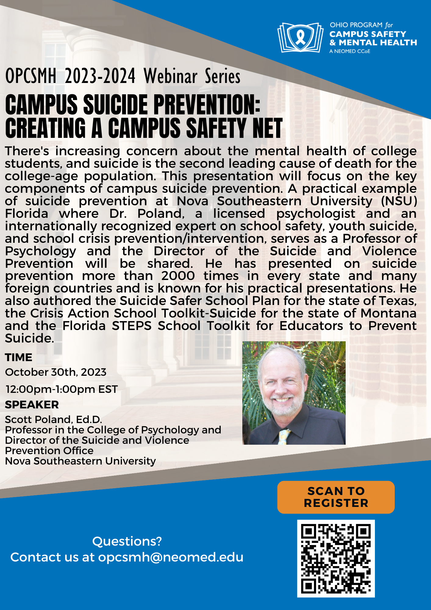 The OPCSMH invites you to join us on Monday, October 30th, 2023, from 12:00pm-1:00pm EST for the OPCSMH October 2023 webinar. Presenter Scott Poland, Ed.D., Professor in the College of Psychology and Director of the Suicide and Violence Prevention Office, Nova Southeastern University, an internationally recognized expert on school safety, youth suicide, and school crisis prevention/intervention will share his knowledge and experience working in campus suicide prevention, as well as share real examples and resources from his time at NSU. Dr. Poland has authored the Suicide Safer School Plan for the state of Texas, the Crisis Action School Toolkit-Suicide for the state of Montana and the Florida STEPS School Toolkit for Educators to Prevent Suicide. Additionally, Dr. Poland has testified about the mental health needs of children before the U.S. Congress on four separate occasions and was a founding member of the National Emergency Assistance Team. We certainly look forward to hearing his expertise on campus suicide prevention and we hope you will join us too!